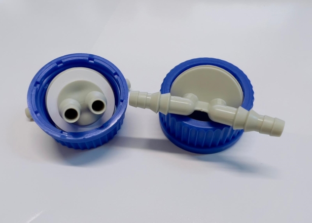 פקק GL45 כחול עם 2 אוליבות בזווית 6-9 מ"מ - לבקבוק מעבדה GL 45