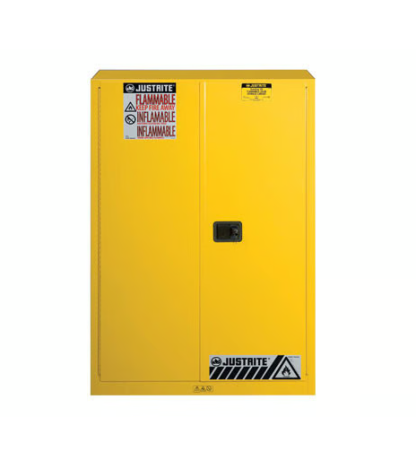 ארון אחסון כימיקלים דליקים צהוב. 45 גלון 2 מדפים, 2 דלתות נסגרות מעצמן Justrite